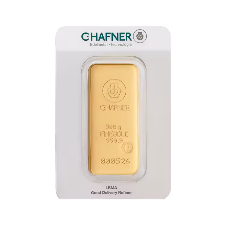 Deze één na grootste C. Hafner goudbaar van 500 gram is voornamelijk erg populair voor beleggers die voor grote bedragen in goud willen investeren. De producent van de goudbaren C. Hafner is sinds 2013 geaccrediteerd door de LBMA, wat betekent dat de goudbaren sindsdien zijn opgenomen in de Good Delivery List. De goudbaren kunnen daardoor wereldwijd worden verhandeld zonder verdere analyse.