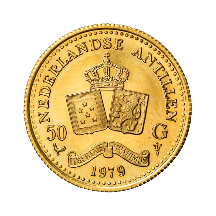 Gouden munt 50 Gulden - Nederlandse Antillen. Deze munt is geslagen in het jaar 1979 en is één de meest bekende gouden munten die geslagen zijn in de Nederlandse Antillen
