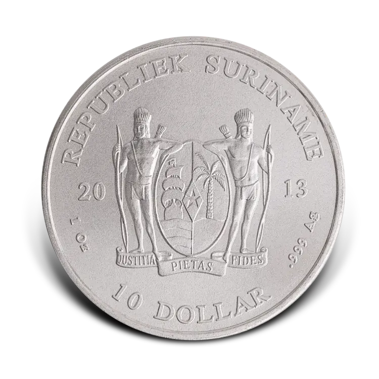 Deze officiële Surinaamse zilveren munt uit 2013 is een bijzondere en gewilde uitgifte voor zowel beleggers als verzamelaars. De munt bevat 1 troy ounce (31,1 gram) puur zilver van 99,9% zuiverheid en is geslagen in hoogwaardige bullion-kwaliteit.