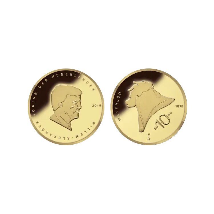 De gouden 10 euro herdenkingsmunt uit 2015 – ook wel bekend als het Waterloo Tientje – is uitgegeven ter nagedachtenis aan de historische Slag bij Waterloo, een beslissend moment in de Europese en Nederlandse geschiedenis. Deze officiële munt is geslagen in de allerhoogste proof kwaliteit, met een spiegelende afwerking die elk detail van het ontwerp verfijnd tot zijn recht laat komen.